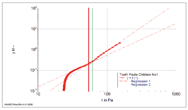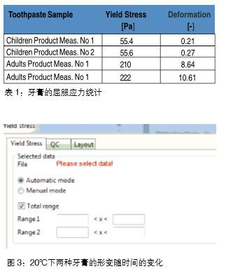 成人及兒童牙膏的測(cè)試曲線在圖3 中顯示。每個(gè)樣品進(jìn) 行了兩次實(shí)驗(yàn),表現(xiàn)出極高的重復(fù)性。樣品的屈服應(yīng)力 總結(jié)在表 1 中。與預(yù)期的一樣,兒童牙膏的屈服應(yīng)力大 約為55Pa 左右,比成人牙膏的215Pa 低很多。哈克 TM RheoWinTM 軟件提供了兩種屈服應(yīng)力分析模式,自動(dòng)和 手動(dòng)(圖4)。當(dāng)儀器不連接軟件時(shí),則只可以使用自動(dòng)分析模式。手動(dòng)模式進(jìn)行分析在可以更加靈活的來進(jìn) 行準(zhǔn)確的數(shù)據(jù)評(píng)估。通常用來評(píng)估屈服應(yīng)力的數(shù)據(jù)范圍 可以通過觀察直接得到,如表 1 中所顯示結(jié)果。但是屈 服應(yīng)力往往依賴于樣品準(zhǔn)備,測(cè)試過程以及評(píng)估方法。 圖 5 就給出了對(duì)于兒童牙膏才去自動(dòng)模式和手動(dòng)模式獲 得的結(jié)果的區(qū)別。