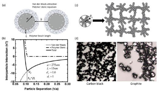 圖3 顆粒間的膠體相互作用和顆粒的組裝行為。(a)炭黑顆粒的聚合物涂層和顆粒間膠體相互作用的示意圖。(b)包覆了PVDF的兩個(gè)炭黑顆粒之間的典型顆粒間作用力。(c)組裝成二次聚集體的初級(jí)炭黑顆粒的示意圖,這些聚集體連接成網(wǎng)絡(luò)。(d)炭黑(左)和石墨(右)顆粒的光學(xué)圖像。