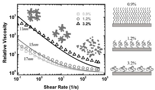 吸收在炭黑顆粒表面的聚合物形態(tài)會(huì)隨著顆粒表面可用空間而變化。當(dāng)炭黑體積分?jǐn)?shù)較低時(shí),總的顆粒表面積更少,吸附在表面的聚合物量更多,聚合物鏈伸展打開。但是當(dāng)碳黑顆粒體積分?jǐn)?shù)高時(shí),例如3.2%,炭黑表面上有足夠的空間容納PVDF,并允許PVDF聚合物鏈保持卷曲的形態(tài)。PVDF聚合物處于“松弛”結(jié)構(gòu),較高濃度的炭黑顆粒導(dǎo)致聚合物長度越小。而兩個(gè)炭黑顆粒之間的最大吸引力取決于吸收的聚合物層的厚度,因?yàn)楫?dāng)顆粒間表面到表面距離達(dá)到2L時(shí),非常強(qiáng)的聚合物空間位阻斥力超過范德華吸引力,起主導(dǎo)作用。對(duì)于較小的聚合物層厚度,兩個(gè)顆粒會(huì)變得更近,從而產(chǎn)生更強(qiáng)的顆粒間范德華吸吸引力。因此,隨著炭黑顆粒的體積分?jǐn)?shù)從0.9%增加到3.2%,粘度急劇增加。