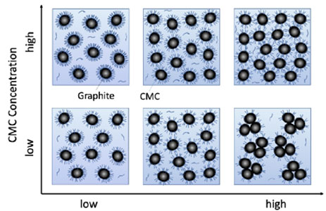 對(duì)于石墨、CMC和水體系,微觀機(jī)制類似。如圖5所示,當(dāng)CMC濃度低(圖5的下部)和低石墨濃度時(shí),顆粒表面吸附足夠量的CMC,抑制石墨顆粒的聚集。隨著石墨濃度的增加,每個(gè)石墨顆粒吸附的CMC量減少(圖5下中心),顆粒之間的相互作用減弱,低剪切速率區(qū)域的粘度降低,高剪切速率區(qū)域出現(xiàn)剪切增厚。石墨濃度的進(jìn)一步增加會(huì)導(dǎo)致每個(gè)顆粒上吸附的CMC量進(jìn)一步減少,使得石墨顆粒之間的相互作用減弱并發(fā)生聚集(圖5右下角),導(dǎo)致粘度增加和數(shù)據(jù)波動(dòng)。在CMC濃度升高時(shí)(圖5上部),即使石墨濃度較高,也能有足夠的CMC被吸附在石墨表面,分散石墨顆粒。因此,粘度不會(huì)顯著增加,并且在高剪切速率范圍內(nèi)也抑制了剪切增稠。分子量最高的CMC提供了更強(qiáng)的空間位阻相互作用,因此對(duì)粘度和剪切增稠的影響更大。