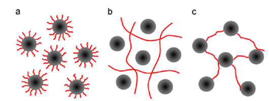 聚合物與顆粒的相互作用,除了包覆(圖6a)之外,還包括(b)粘結(jié)劑相成三維網(wǎng)絡(luò)結(jié)構(gòu),空間位阻作用阻止顆粒的團(tuán)聚;(c)粘結(jié)劑與活性物質(zhì)顆粒表面鍵合作用,將顆粒之間連接在一起,這是漿料形成凝膠結(jié)構(gòu),粘度比較高。