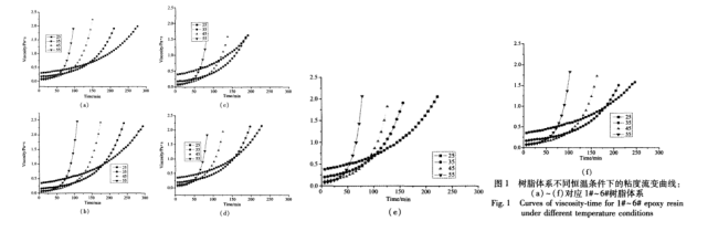 測(cè)試 RIMR?。埃常担銟?shù)脂體系在 25℃ 、35℃ 、45℃ 、55℃恒溫條件下的粘度 , 圖 1(a)、圖 1(b)、圖 1(c)、圖 1(d) 、圖 1(e)、圖 1(f)分別 為 1#-6#環(huán)氧樹(shù)脂體系在 25~55℃不同恒溫條件下的實(shí)測(cè) 粘度曲線。 在