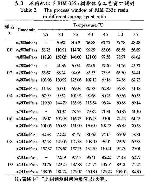 將擬合獲得的參數(shù)方程代 回實(shí)際曲線的擬合模型,模型中僅剩未知變量粘度 、溫度和時(shí)間 。 通過(guò)上述非常 規(guī)的二次 曲線擬合方法 , 獲得該環(huán)氧樹(shù)脂體系的等溫粘度與溫度和時(shí)間 的關(guān)系 。 本文以 300mPa?s、500mPa?s、800mPa?S三點(diǎn)為分界點(diǎn),根據(jù)模型計(jì)算不同溫度下該樹(shù)脂體系從初始粘度上升至這三個(gè)粘度點(diǎn)所需要的時(shí)間,即為工藝窗口,如表 3所示 。