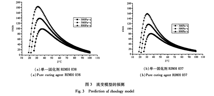 從表 3 中可以看出,同一配比下,達(dá)到同一目標(biāo)粘度的時(shí)間 隨溫度升高先增加再降低 ; 而同一溫度下,隨著固化劑RIMH?。埃常负康脑黾?,達(dá)到目標(biāo)粘度的時(shí)間先降低再升高。x=0.0 時(shí) ,最長(zhǎng)適用期為114. 7min,對(duì)應(yīng)溫度為 35℃;x=1.0時(shí),最長(zhǎng)適用期為 137. 88min,對(duì)應(yīng)溫度為35℃。 說(shuō)明預(yù)測(cè)模型的變化規(guī)律與實(shí)驗(yàn)測(cè)試結(jié)果吻合。 使用單一固化劑RIMH 037 和 RIMH?。埃常?,該環(huán)氧樹(shù)脂體系 在不同溫度下達(dá)到目標(biāo)粘度300mPa?S、500mPa?s和800mPa?S時(shí)溫度 與時(shí)間的關(guān)系如圖3所示。 從 圖 3 中可以看出 ,兩種固化劑配比下的樹(shù)脂體系在 3O~35℃ 下的適用期最長(zhǎng),結(jié)合表3數(shù)據(jù)可以看出,不同固化劑配比下該樹(shù)脂體系的最佳灌注溫度均在 30~35℃。