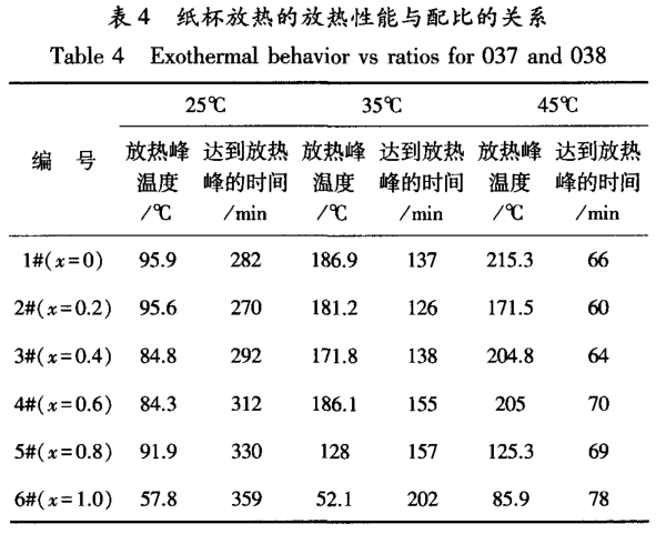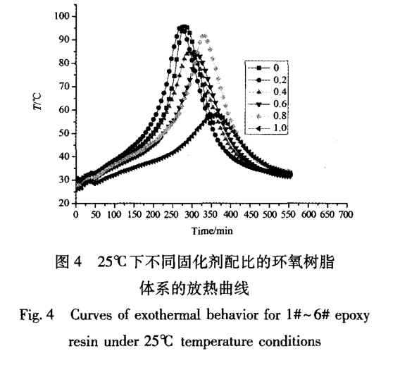 從表 4 中可以看出 ,在同一恒溫水浴溫度下,不同固化劑配比的環(huán)氧樹(shù)脂體系中使用單一固化劑RIMH 038的樹(shù)脂體系的放熱峰溫度最低 ,其在 25℃、35℃ 、45℃下的放熱峰溫度分別為 57.8℃、52.1℃ 、85.9℃,使用單一固化劑RIMH?。埃常?的樹(shù)脂體系的放熱峰溫度最高,其在 25℃、35℃、45℃下的放熱峰溫度分別為95.9℃ 、186.9℃、215.3℃,其他配比下的放熱峰溫度與單一固化劑RIMH?。埃常?的樹(shù)脂體系