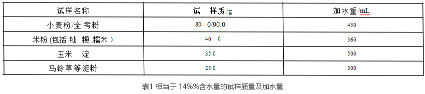 將稱好的試樣置于燒杯中,按表 1 量取相應的加水量,先加入約 100 mL 水,用玻璃棒攪拌約 20 s,然后分兩次每次約加入 100 mL 水制成均勻無結塊的懸浮液 ,將其轉(zhuǎn)移至測量缽中,再用剩余的水分三次洗滌燒杯中殘余試樣并全部轉(zhuǎn)移至測量缽中。從加樣到?jīng)_洗試樣時間應控制在 2 min 以內(nèi)。