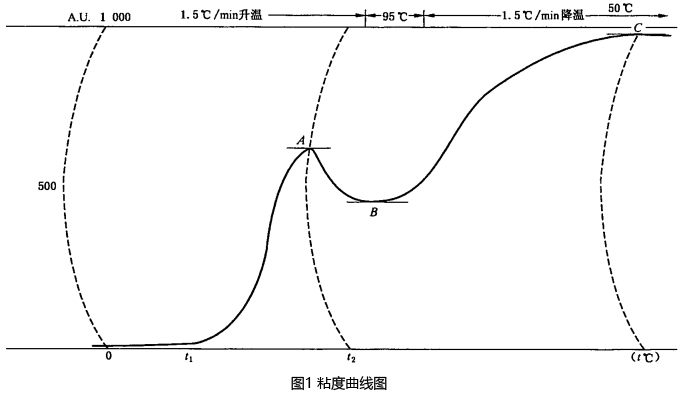 C一一最終粘度值(A. U. ),糊化物按一定降溫速率冷卻時,糊化物膠凝,粘度值升高,溫度降至 50℃時的粘度值為最終粘度值 ,讀數(shù)準確至5 A. U.
