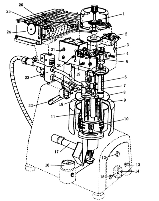 5.7.2 擔緊儀器升降柄 ,將儀器上半部向左轉(zhuǎn)動 90° ,然后轉(zhuǎn)動升降柄緩慢放下機身,將攪拌器插人傳感豎軸銷子使緊密相連。