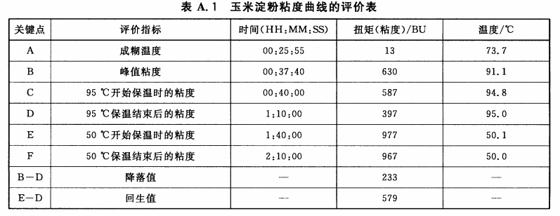 A4玉米淀粉的粘度曲線參見圖 A, 1;玉米淀粉粘度曲線的評(píng)價(jià)表參見表 A.1