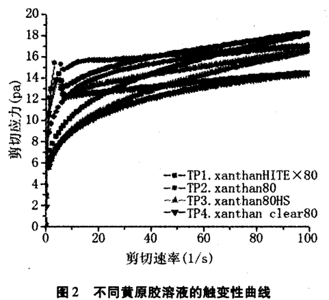 圖 2 中各黃原膠溶液的觸變性較相近, 由于滯后曲線中形成支弧形,表示溶液有凝膠強度,因破壞凝膠結(jié)構(gòu)需要的應(yīng)力,使溶液恢復(fù)正常表觀粘度。