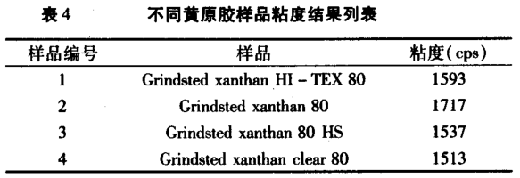 1%黃原膠溶于 1% 氯化鉀溶液,25℃,粘度測試結(jié)果,見表 4。