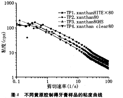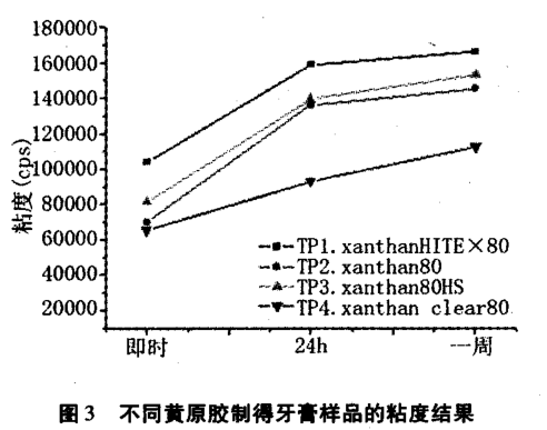 由圖 3 可知 ,不 同黃原膠制得 的牙膏樣 品粘度順序 :TPI—xanthan HITEX80> TP3 一xanthan?。福埃龋樱?TP2 一xanthan80> TP4 一xanthan clear80 。