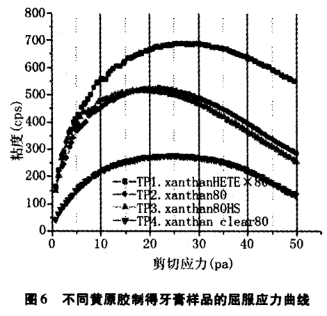 (3)屈服應(yīng)力可體現(xiàn)牙膏的制造和包裝容易性,4 一xanthan clear80 更容易運輸, 洗刷分散性更好,更容易從牙膏管中擠出。