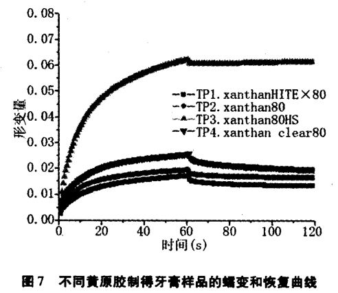 在很短的時間內(nèi)樣品顯示出瞬間很大的形變,表明膏體具有彈性,在試驗時間內(nèi)顯示出最小 量的變形,這兩點揭示樣品在貯存期間內(nèi)膠水收縮作用較小,顯示了更好的穩(wěn)定性。 由圖 7 可知, 當(dāng)剪切應(yīng)力消除時,四個樣品都未能恢復(fù)至原始水平。 形變量越小,則體系越穩(wěn)定, 牙膏體系穩(wěn)定性 :TP1>TP2> TP4 >一TP3。