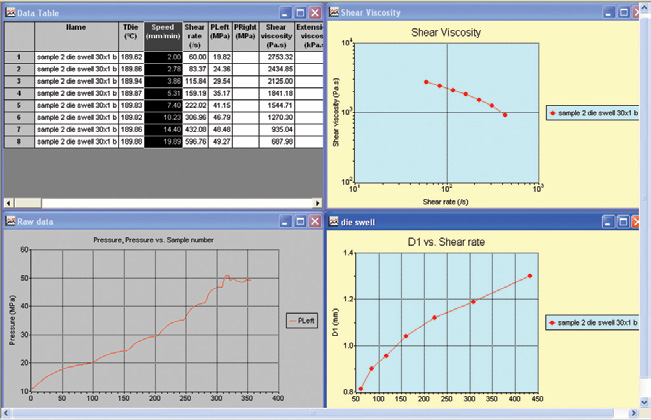測量口模出口附近的擠出物料直徑。測量過程由控制軟件直接控制,擠出脹大數(shù)據(jù)保存在標(biāo)準(zhǔn)數(shù)據(jù)文件中。
