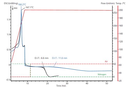 OIT 測(cè)試(氧化誘導(dǎo)時(shí)間)是用于評(píng)價(jià)聚合物特別是聚烯烴耐氧化性的常用測(cè)試方法。在這個(gè)例子中,兩個(gè) PP 樣品在動(dòng)態(tài)氮?dú)鈿夥障录訜岬?200°C。在加熱過程中檢測(cè)到的吸熱峰對(duì)應(yīng)于聚丙烯的熔融。在 200°C 恒溫 3 分鐘,將氣體切換至空氣。其后出現(xiàn)的放熱效應(yīng)為聚合物的氧化分解。此例中,樣品A(OIT 6.6分鐘)比樣品B(OIT 11.6分鐘)更早的發(fā)生了氧化反應(yīng)。