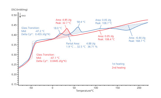 除了峰值為 121℃(藍(lán)色曲線)和 118℃(紅色曲線)的主峰外,還有 97℃ 的峰(藍(lán)色曲線)和 107℃ 的肩峰(紅色曲線),小的吸熱峰說明材料中還存在另外一種組分,材料 A 中的這一組分導(dǎo)致了較早的成核過程。