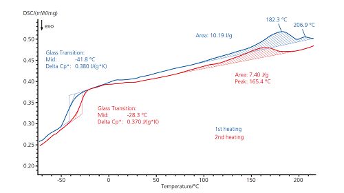 圖中顯示了看似相同的兩種顆粒的 DSC 曲線,樣品為 PA66,分別在不同時(shí)間交付(以 20K/min 的速率降溫后二次升溫)。藍(lán)色曲線(舊樣)上在 63°C 出現(xiàn)玻璃化轉(zhuǎn)變,263°C 出現(xiàn)熔融峰,均為 PA66 的典型表現(xiàn)。在新料(紅色曲線)上則出現(xiàn)了雙峰,峰值溫度為 206°C 和 244°C。這表明新料中可能存在與 PA66 共混的第二種聚合物。