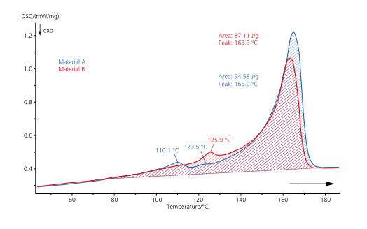 通過二次升溫曲線可做進(jìn)一步驗(yàn)證,除了 165℃ 和 163℃ 的吸熱峰(PP材料典型的熔融峰),藍(lán)色曲線在 110℃ 和 124℃ 還有兩個(gè)吸熱峰,說明材料 A 中還含有 LDPE、LLDPE 或 HDPE(熔融溫度隨密度增大而升高)等額外的組分。相反,材料 B 中僅在 126℃ 有一個(gè)小的吸熱峰。