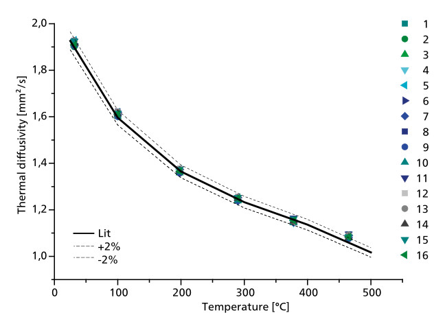 譜圖顯示了使用 LFA 467 一次裝載 16 個 Pyroceram 樣品(厚度為 2.5mm,直徑為 12.7mm)進行室溫至 500℃ 的測試。測量結(jié)果與理論值之間的偏差 < 2%。