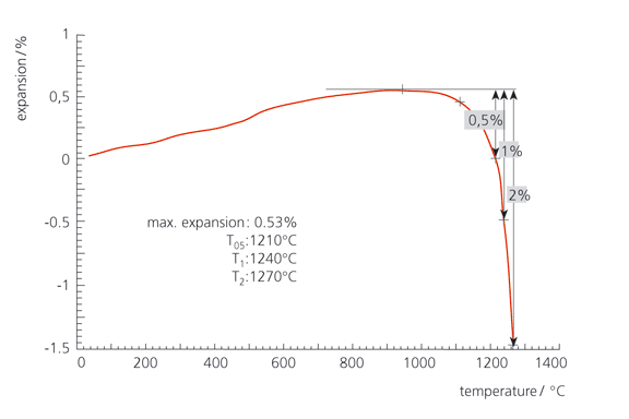 下圖顯示了從耐火磚(約含 35% Al2O3)上取得的試樣進(jìn)行 RUL 測試得到的結(jié)果。測試條件:0.2 N/mm2,5 K/min,靜態(tài)空氣。試樣在 960°C 達(dá)到最大膨脹。在 1210°C(T05)、1240°C(T1)與 1270°C(T2)達(dá)到相應(yīng)的 0.5%,1.0% 與 2.0% 形變。