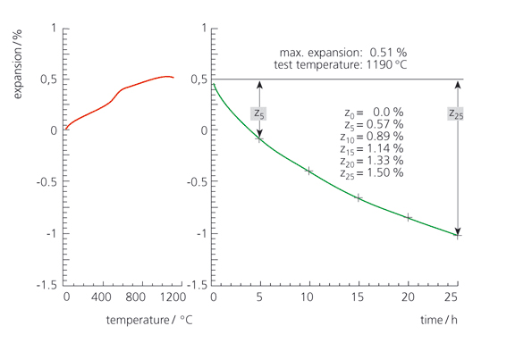 下圖顯示了從耐火磚(約含 35% Al2O3)上取得的試樣進(jìn)行 CIC 測試得到的結(jié)果。測試條件:0.2 N/mm2,5 K/min,1190°C 恒溫 25 小時(shí);靜態(tài)空氣。圖中左側(cè)為動(dòng)態(tài)升溫曲線,右側(cè)為恒溫段的測試結(jié)果。