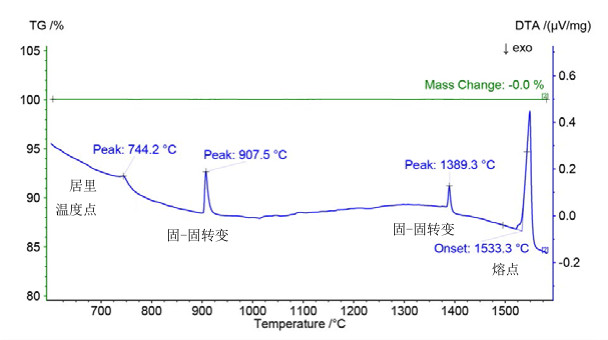 STA 2500 Regulus 的高靈敏度 DTA 能夠檢測(cè)微弱的相轉(zhuǎn)變。此外,通過自動(dòng)真空裝置的抽真空和充填可以得到純凈的氣氛。右圖顯示了在 STA 上測(cè)量純鐵樣品,溫度范圍為室溫至 1600℃。在藍(lán)色的 DTA 曲線上,744℃ 的熱效應(yīng)是由于材料的磁性轉(zhuǎn)變所致。峰值溫度為 908℃ 和 1389℃ 的吸熱峰表明發(fā)生了晶型轉(zhuǎn)變。起始點(diǎn) 1533℃ 的吸熱峰則為熔融。在 TG 曲線上沒有重量的變化,表明了系統(tǒng)具有良好的密封性,能確保惰性氣氛的純凈性。