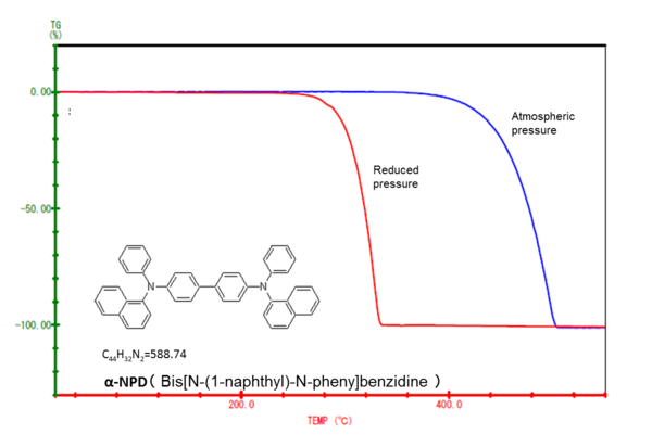 多層有機(jī)結(jié)構(gòu)有特殊的光學(xué)與物理學(xué)性能,可用于光電設(shè)備,如有機(jī)發(fā)光二極管(OLED)。在有機(jī)多層結(jié)構(gòu)中,α-NPD是一種孔狀傳輸材料。STA 2500 Regulus 的真空密閉結(jié)構(gòu)允許樣品在減壓條件下測(cè)試。在常壓下,α-NPD 在 380℃ 開始升華(藍(lán)色曲線),而在減壓條件下,樣品的升華起始溫度下降,從 240℃ 就開始升華(紅色曲線)。