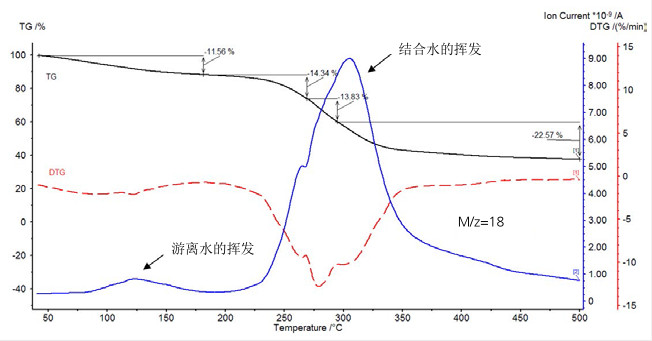 最近,煙草行業(yè)采用一種新的技術(shù),使香煙更具吸引力。這一技術(shù)是將一個(gè)充滿調(diào)味液體的膠囊,嵌在香煙的過濾嘴里。這種膠囊可以改變煙草的味道或保持其濕潤(rùn)。左圖給出了浸水的膠囊在 50 至 500℃ 范圍內(nèi)熱重與質(zhì)譜聯(lián)用的測(cè)量結(jié)果。水的揮發(fā)有多個(gè)失重臺(tái)階(黑色的 TGA 曲線與紅色的 DTG 虛線),從 MS 質(zhì)量數(shù) 18 的信號(hào)可以得到確認(rèn)。歸功于在測(cè)量之前,天平能夠快速達(dá)到穩(wěn)定,這樣才能檢測(cè)在結(jié)合水釋放之前的游離水的揮發(fā)。