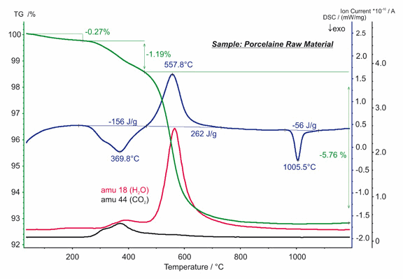 對陶瓷原材料的 STA 測試顯示了三個失重臺階。在約 250°C 以下,為吸附水的揮發(fā)。在 250°C 至 450°C 之間,觀察到了有機組分的燒失,釋放了 156 J/g 的能量。高嶺土的脫水發(fā)生在 450°C 以上,吸熱熱焓為 262 J/g。質譜曲線上的 18 與 44 質量數對應于 H2O 與 CO2 的逸出。1006°C 的 DSC 放熱峰(熱焓 -56 J/g)是由于固相轉變所致。