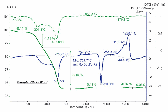 玻璃棉常用作房屋與加熱管道的隔熱材料。STA 測試在約 600°C 以下顯示了三個失重臺階,這些是由于吸附水的揮發(fā)與有機粘合劑的燒失所致。其中有機粘合劑的燒失對應于該溫度范圍內的強烈的 DSC 放熱峰。玻璃化轉變在 DSC 曲線上表現為 728°C 附近的臺階,比熱增加 0.41J/(g*K)。950°C 的 DSC 放熱峰對應于結晶效應,熱焓 -287 J/g;1050°C 至 1250°C 之間的吸熱效應對應于熔融,總熱焓 549 J/g。700°C 以上的微量的質量變化最可能是由于雜質的氧化與揮發(fā)所致。