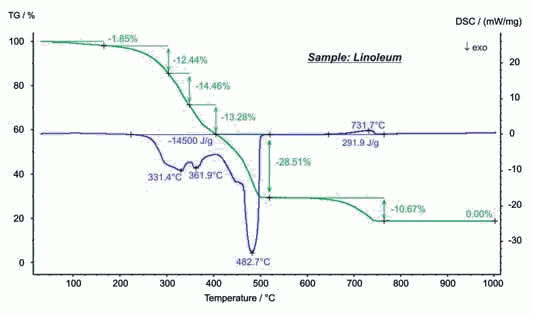 油氈作為一種建筑材料發(fā)明于1863年,常用于樓面覆蓋,具有堅固、絕緣等特點。通過STA在空氣氣氛下的測試,可揭示油氈的自然組成。150°C之前是水分的揮發(fā),隨后的 200°C 至500°C 之間多步的失重主要是亞麻子油、天然樹脂、軟木屑、木屑和黃麻襯底等的燒失,伴隨著較大的放熱效應,在該氧化過程中釋放的熱量達 14.5KJ/g。在 600°C…750°C 之間,主要是填充物 CaCO3 的熱分解。