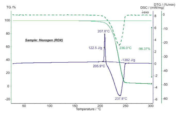 烈性炸藥黑索金(也稱RDX,T4等)在150°C 就開始升華,從熱重曲線即可看出。在DSC曲線上,起始點為206°C的吸熱峰,主要是樣品的熔融,其熱焓值為123J/g。在200°C…250°C之間,有劇烈的放熱現象,并釋放出1.38KJ/g的熱量。該實驗的樣品量為2.32mg,升溫速率為5K/min,氣氛為合成空氣。