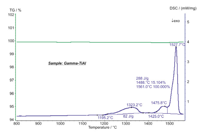 難熔合金 γ-TiAl 可通過高溫和低密度耐腐蝕測試進行鑒別。一般用于航空航天領域的渦輪充電器、燃氣渦輪和發(fā)動機。圖中 DSC 曲線顯示,在外推起始點溫度 1195°C 時有一吸熱效應(峰值溫度為1323°C),主要是 α2 →α 相轉變過程。在 1476°C(峰值溫度)時,α 相向 β相轉變。DSC曲線上 1528°C 時的吸熱峰主要是樣品的熔融過程(起始點溫度:1490°C,液相線溫度大約 1560°C)。在整個測試過程中,樣品質量無明顯變化。