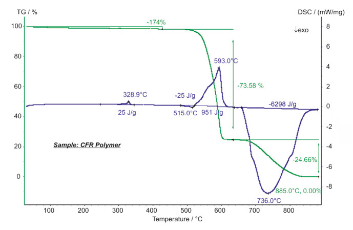 碳纖維增強高聚物(CFRP)是常用的復合材料。主要由聚合物和嵌入的碳纖維組成,具有質量輕、硬度大、穩(wěn)定性強等特點,適合汽車、航空航天領域的應用。STA 的測試結果顯示,在 329°C 有一吸熱峰,其熱焓值為 25J/g,主要是聚合物的熔融過程。在大約 480°C…620°C之間主要是聚合物的分解。在 650°C,將氣氛由 N2 切換成 O2,碳纖維組分發(fā)生放熱分解(失重:24.7%)。實驗結束時的殘余質量 0.0% 表明樣品中無其他無機填充物或者玻璃纖維。