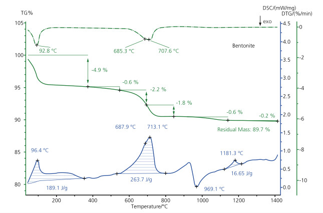 斑脫巖是一種粘土,主要由膠嶺石所組成,由于其吸附能力而為人稱道。該礦物材料常被應用于粘合劑,凈化器等領域。本圖中綠色曲線為 TG,綠色點狀線為 DTG,藍色曲線為 DSC 曲線。第一失重步驟(DSC 峰值溫度 96℃)由水的釋放所引起,隨后有一 0.6% 的小的失重過程,很可能由有機雜質(zhì)裂解所引起,表明材料中含有少量黃鐵礦雜質(zhì)。在 600℃ 以上,水從斑脫巖結構中釋放出來(DTG 峰溫 685℃ 與 708℃)。DSC 曲線在 969℃ 的放熱峰代表了該礦物的相轉(zhuǎn)變。1181℃ 的吸熱峰最可能的原因是部分熔融。