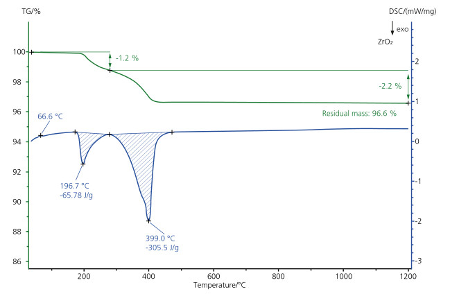 下圖的測量溫度范圍為室溫至 1200℃,綠色曲線為 TG 曲線,在 450℃ 之前有兩個小的失重過程,總失重量 3.4%,與藍色 DSC 曲線上的 197℃、399℃ 兩個放熱峰很吻合。這些效應是由于陶瓷材料中粘合劑的燒出所致,熱值較高,峰形較大。67℃ 附近的小的 DSC 吸熱峰則由粘合劑的熔融所致。