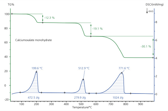 下圖顯示了室溫至 1000℃ 溫度范圍內(nèi),CaC2O4-H2O 的 TGA 與 DSC 曲線。第一階段失重臺階為脫水過程,樣品脫水之后轉(zhuǎn)變?yōu)闊o水草酸鈣(CaC2O4)。第二階段失重臺階是由 CO 的釋放所致,代表了從草酸鈣向碳酸鈣(CaCO3)的轉(zhuǎn)變。在 700℃ 以上,碳酸鈣分解,釋放 CO2 ;殘余質(zhì)量為氧化鈣(CaO)。實驗測量到的失重量與理論值非常吻合(偏差 < 1%)。這證明了 STA 449 F5 Jupiter® 熱天平擁有很高的測量準確性。
