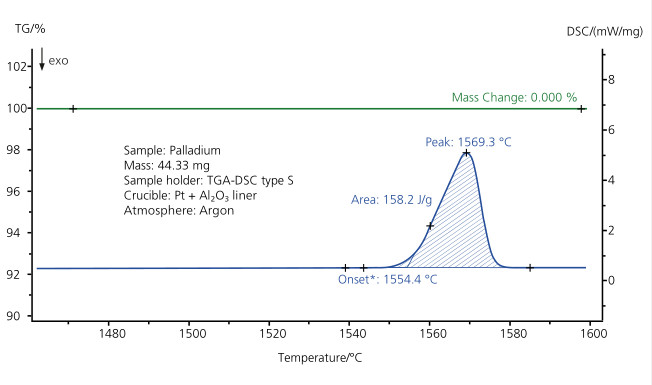 鈀(Pd)在今天的最大的用途是作為催化轉(zhuǎn)換器。此外,它也常被用于牙科、飛機火花塞、手術器械、電接觸材料等其他領域。鈀在室溫下與氧無反應,但當在空氣氣氛下加熱至 800°C 時,將生成一層非常薄的鈀(II)氧化物(PdO)。此圖顯示了在 STA 上進行的 Pd 的測量,最高溫度 1600°C。藍色的 DSC 曲線顯示了熔融過程,熱焓 158 J/g,熔融起始點 1554°C。這兩個值均與純 Pd 的理論值非常接近,偏差 < 1%。綠色的 TG 曲線顯示,在熔融前后未發(fā)生失重;這證明了金屬的高純度,以及系統(tǒng)的真空密閉性。