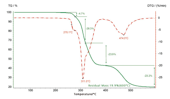 • 可對熱重曲線作一階微分(DTG)與二階微分,并可進(jìn)行峰值溫度標(biāo)注。