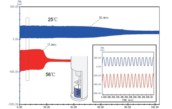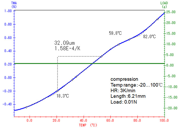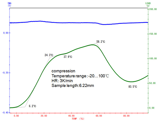 隨著溫度的上升,樣品的自然膨脹趨勢(shì)越來越大,要維持固定的壓縮形變量所需的力也相應(yīng)增大,直至自 58°C 起樣品發(fā)生玻璃化轉(zhuǎn)變之后,樣品模量下降,所需的負(fù)載力才相應(yīng)下降。