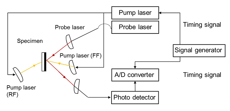 納米級(jí)薄層與薄膜的熱透過(guò)時(shí)間極短,傳統(tǒng)的激光閃射法(LFA)使用紅外測(cè)溫,采樣頻率相對(duì)較低,已不足以有效地捕捉納米級(jí)薄膜的傳熱過(guò)程。因此需要一種新的更快速的檢測(cè)方式,可以克服經(jīng)典的激光閃射法的技術(shù)局限。這一被稱為超快速激光閃射法的技術(shù),其典型模式為后部加熱/前部探測(cè)方法。