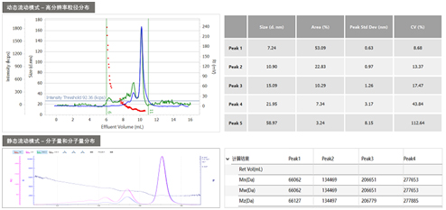 BeNano動(dòng)靜態(tài)流動(dòng)模式(Flow Mode)是將納米粒度及Zeta電位儀同一個(gè)分離前端(FFF、GPC/SEC)相連接。分離前端可以根據(jù)尺寸將樣品進(jìn)行分離,依次流出。通過(guò)檢測(cè)每個(gè)流出組分的動(dòng)態(tài)光散射信號(hào)和靜態(tài)光散射號(hào),并結(jié)合分離前端的示差折光RI或者紫外UV信號(hào),得到高分辨率且不依賴于計(jì)算模型的粒徑分布、分子量分布信息。