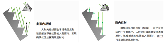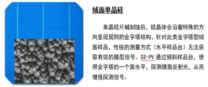 SE-PV獨特的設(shè)計可以滿足絨面基底上薄膜的量測需求,如下圖所示的樣品,絨面及其表面增透膜層的設(shè)計都是為了降低電池片表面對太陽光的反射,這使得探測信號變?nèi)?,大大增加了光學(xué)測量難度。