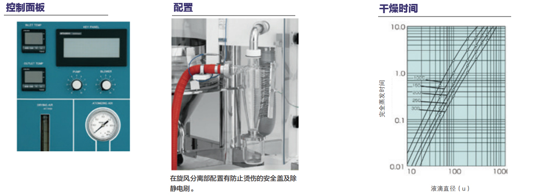 調(diào)節(jié)功能:入口溫度、熱風(fēng)量、泵送液量、噴霧空氣壓、篩眼清掃時間 指示計:入口溫度、出口溫度、干燥空氣、風(fēng)量計、噴霧空氣壓力計 |