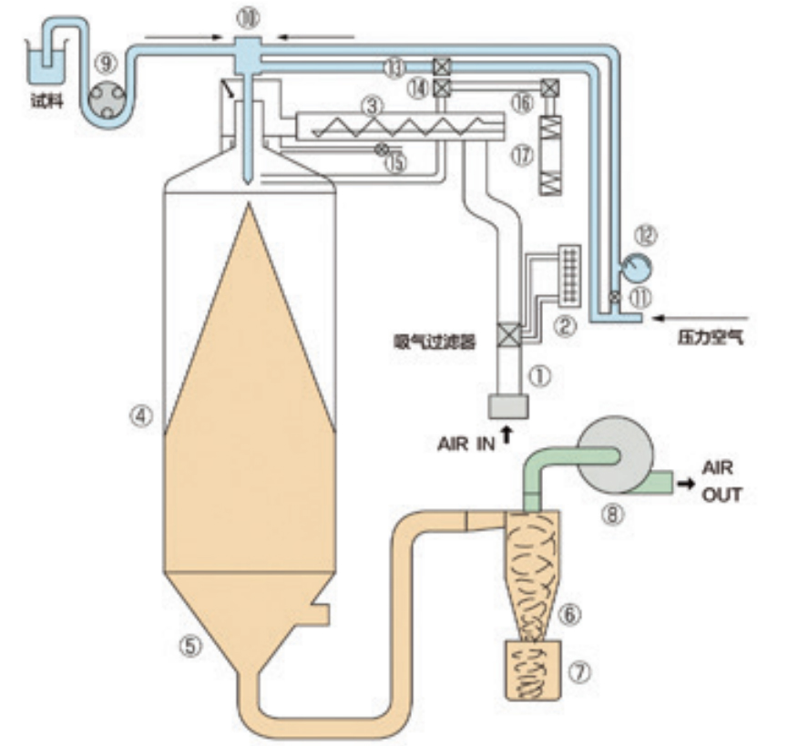 干燥室、旋風(fēng)部、生成物容器:超硬玻璃制,其它配管材料為不銹鋼及硅膠軟管 |